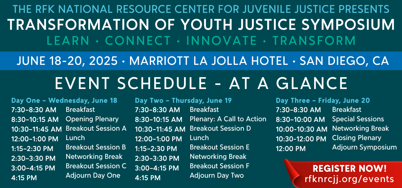 On June 18-20, 2025, in vibrant San Diego, California, the RFK National Resource Center will host a dynamic 2.5-day National Symposium designed for multi-disciplinary professionals and youth-serving stakeholders committed to advancing youth justice transformation. This unique event offers opportunities to learn, connect, and contribute to a national movement dedicated to improving outcomes for children and families through transformative practices.