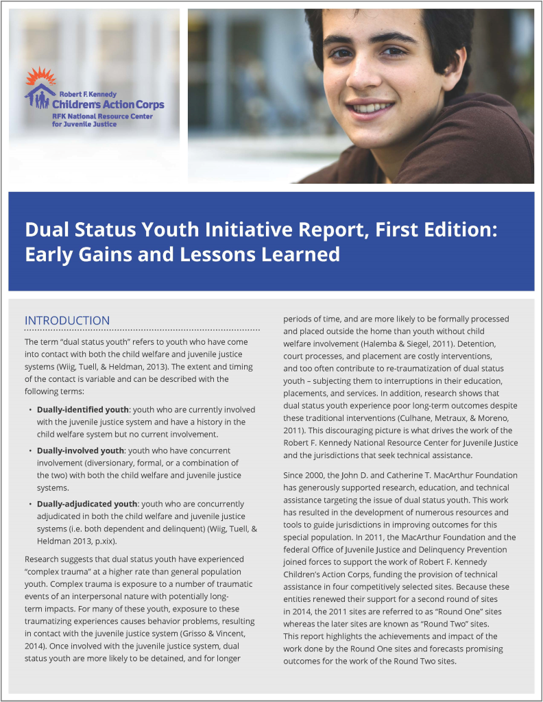 Through the support of the John D. and Catherine T. MacArthur Foundation and the federal Office of Juvenile Justice and Delinquency Prevention, the RFK National Resource Center led two rounds of 12-month initiatives undertaken in eight jurisdictions, known as the Dual Status Youth Technical Assistance Initiatives. This report highlights the challenges, achievements, and impact of the work done by the first four (“Round One”) sites and forecasts promising outcomes for the work of the subsequent four (“Round Two”) sites.