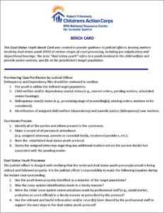 This Dual Status Youth Bench Card was created to provide guidance to judicial officers hearing matters involving dual status youth (DSY) at various stages of court processing, including pre-adjudicatory and dispositional hearings.