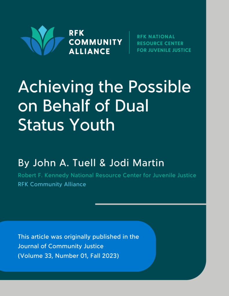 This article, published in the Journal of Community Justice (Vol. 33, No. 01, Fall 2023), reviews the research on dual status youth programs and describes specific RFK National Resource Center collaborations with initiatives in four Ohio counties. The Ohio Supreme Court, in partnership with the RFK National Resource Center, has modeled how state level support in collaboration with local jurisdictions can produce highly effective, research-informed, replicable practices to improve outcomes for dual status youth in participant jurisdictions. This approach has the potential to produce exponential gains that literally save the future of dual status youth and reduce the historical duplication of resources in an atmosphere of strained service availability.