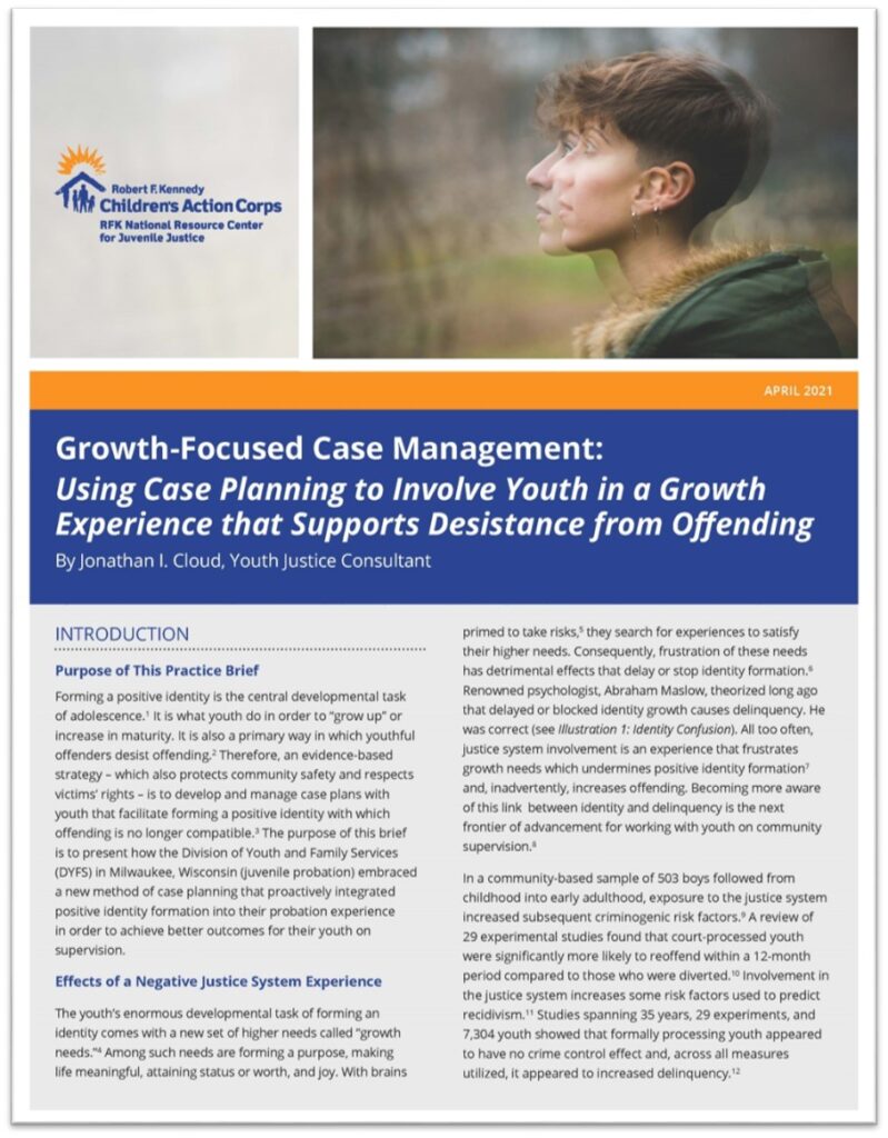 This Practice Brief presents the new Growth-Focused Case Management (GFCM) and supervision approach, which empowers youth to form a positive identity and progress beyond mere cessation of delinquent activity. In addition to protecting community safety and respecting victims’ rights, the purpose of GFCM is to develop and manage case plans with youth that facilitate forming a positive identity with which offending is no longer compatible. The GFCM principles and four-phase framework, detailed in this brief, are supported by evidence-based research and are currently being implemented in several jurisdictions throughout the country. This brief also presents how the Division of Youth and Family Services (DYFS) in Milwaukee, Wisconsin embraced and integrated GFCM into their juvenile probation experience in order to achieve better outcomes for their youth under supervision; while Milwaukee DYFS is still early in its GFCM implementation process, the preliminary outcomes are already very promising.