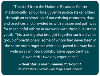 The National Resource Center offers a variety of on-site training opportunities addressing critical topics in juvenile justice. We bring experts and experienced facilitators to you, ensuring that all vital leaders, staff, and stakeholders have the opportunity to benefit from the training. Each curriculum is based on well-established frameworks for reform that have been applied in numerous jurisdictions throughout the nation, while also incorporating current research and emerging best practices. Our trainers work with you to identify your jurisdiction’s unique goals and the training is then tailored to meet those goals. Our training approach balances traditional presentation with interactive discussions and facilitated activities aimed at applying the information to each individual jurisdiction. As a result, participants conclude the training well-informed and poised to begin taking action immediately.